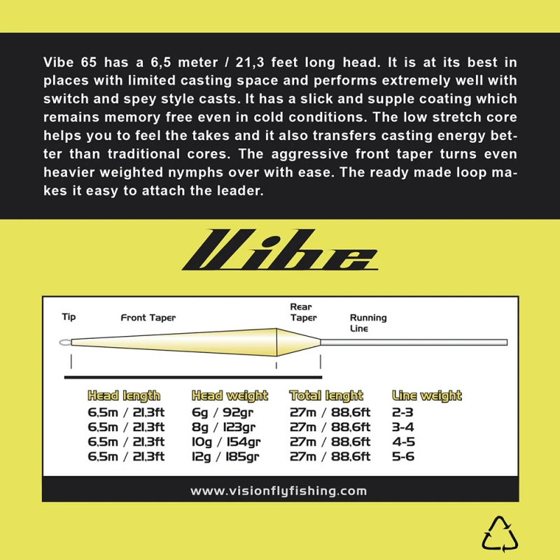 Vision Vibe 65 is een flugline korte kop en agressief taps toelopend aan de voorkant. Een lijn voor harde en korte worpen die effectief werpt met switch en spey casts!